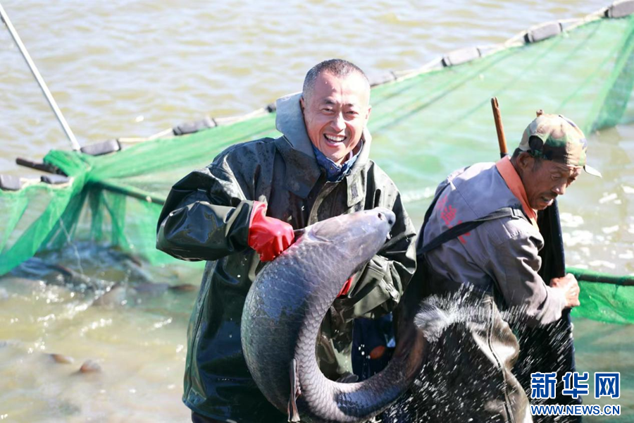 養殖戶在漁場里捕撈淡水魚。新華網發