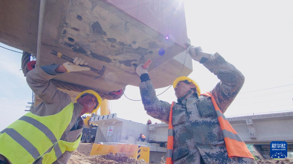 5月19日,工人在沈山鐵路鴨子河中橋新建大橋架梁工程現場施工。