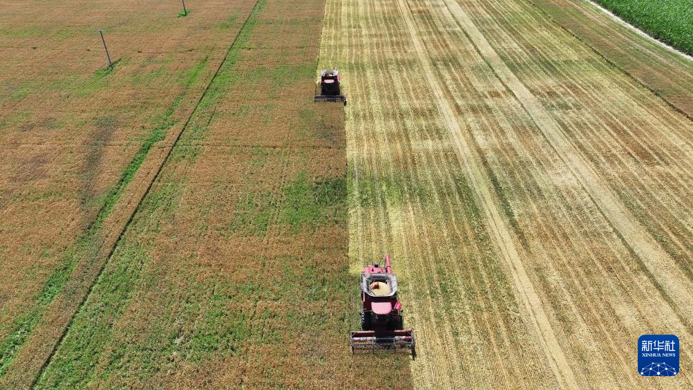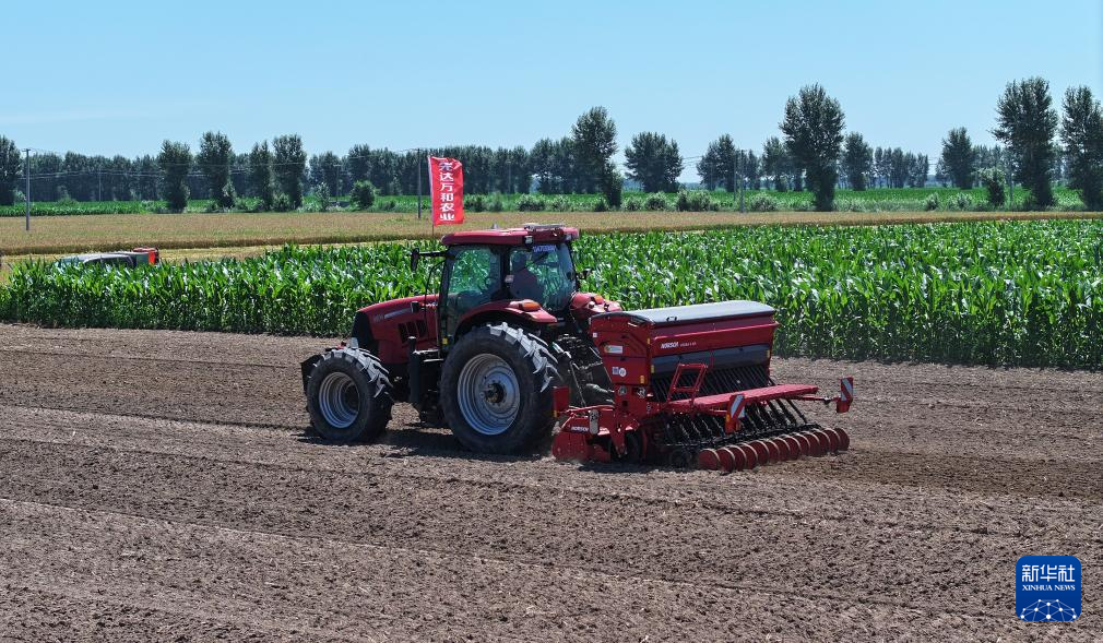 7月7日,在遼寧省阜新市彰武縣,播種機在前日才收割小麥的地塊播種大豆(無人機照片)。