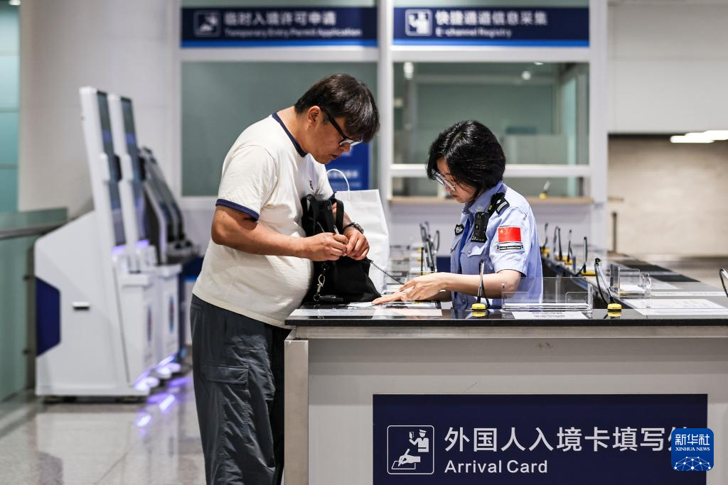 7月9日,大連周水子出入境邊防檢查站民警幫助入境的韓國旅客填寫外國人入境卡。