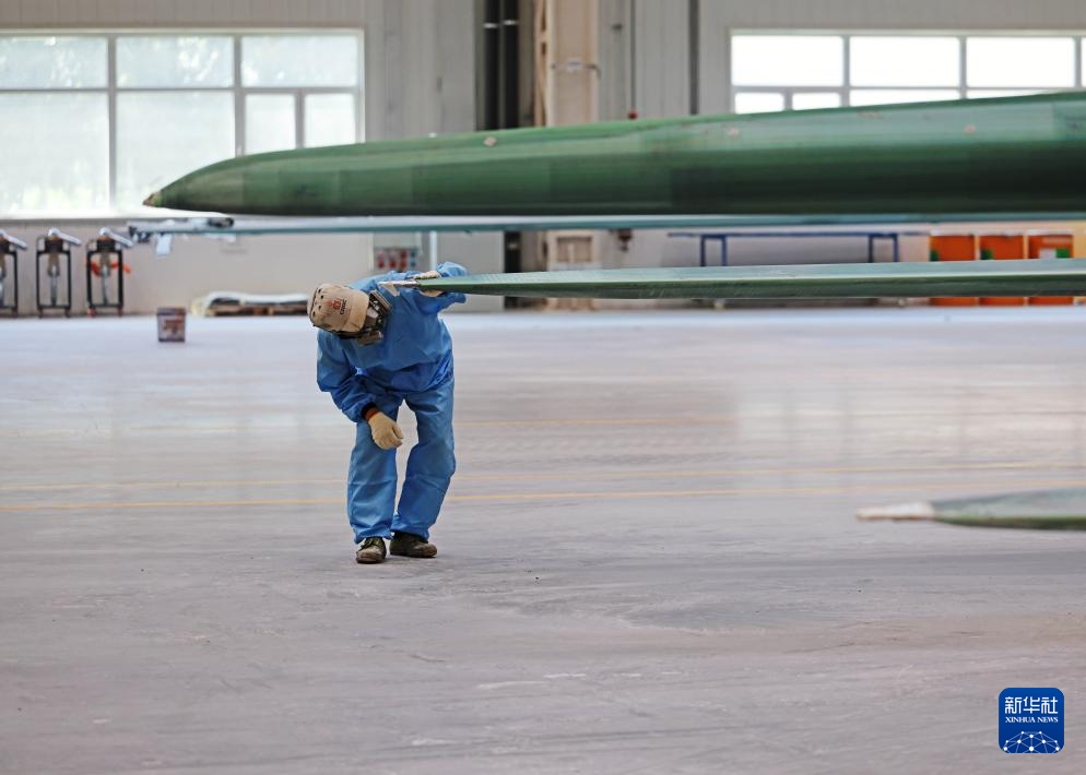 7月30日在鐵嶺明陽新能源有限公司拍攝的風力發電機葉片(無人機照片)。