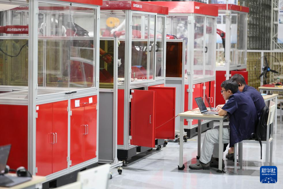 8月27日,在新松機器人自動化股份有限公司車間,工程師在調試工業機器人。