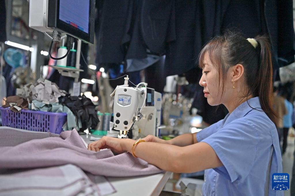 8月28日,工人在遼寧省大連市大楊集團的服裝生產車間工作。
