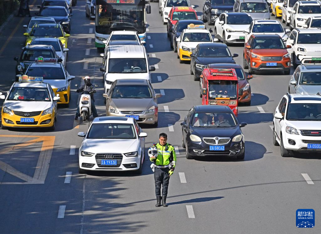 9月18日,交警在沈陽崇山中路脫帽佇立。新華社記者 周華 攝