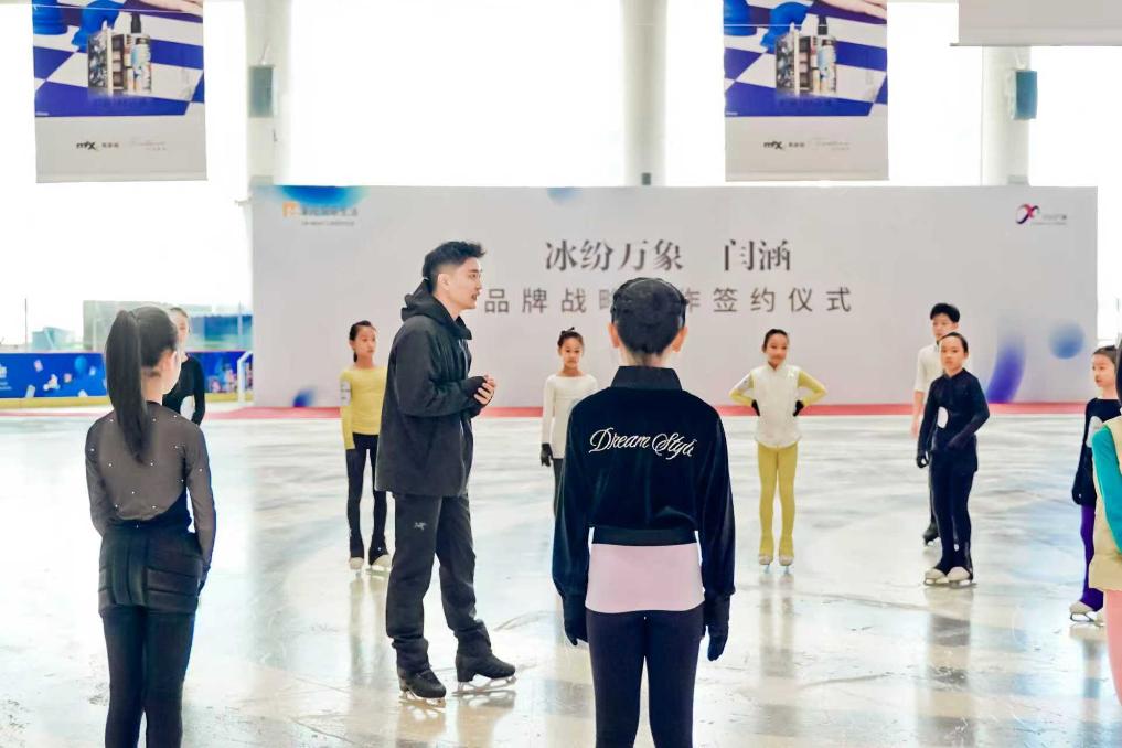 簽約儀式現場氣氛熱烈。三名花樣滑冰小選手率先獻上了技藝嫻熟的表演,靈動的旋轉與流暢的步法贏得了滿堂彩。隨后的“小課堂”上,閆涵親自上冰,對小學員們進行了細致的技術指導和動作示范,奉獻了一場“干貨”滿滿的教學課?;顒游猜?,他還與現場花滑愛好者圍坐交流,親切分享個人運動生涯的心得與故事。