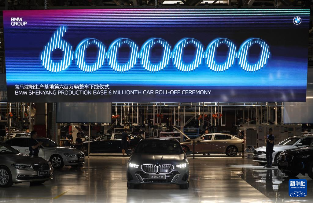 這是2024年5月8日在寶馬沈陽生產基地拍攝的華晨寶馬第600萬輛整車下線儀式。新華社記者 潘昱龍 攝