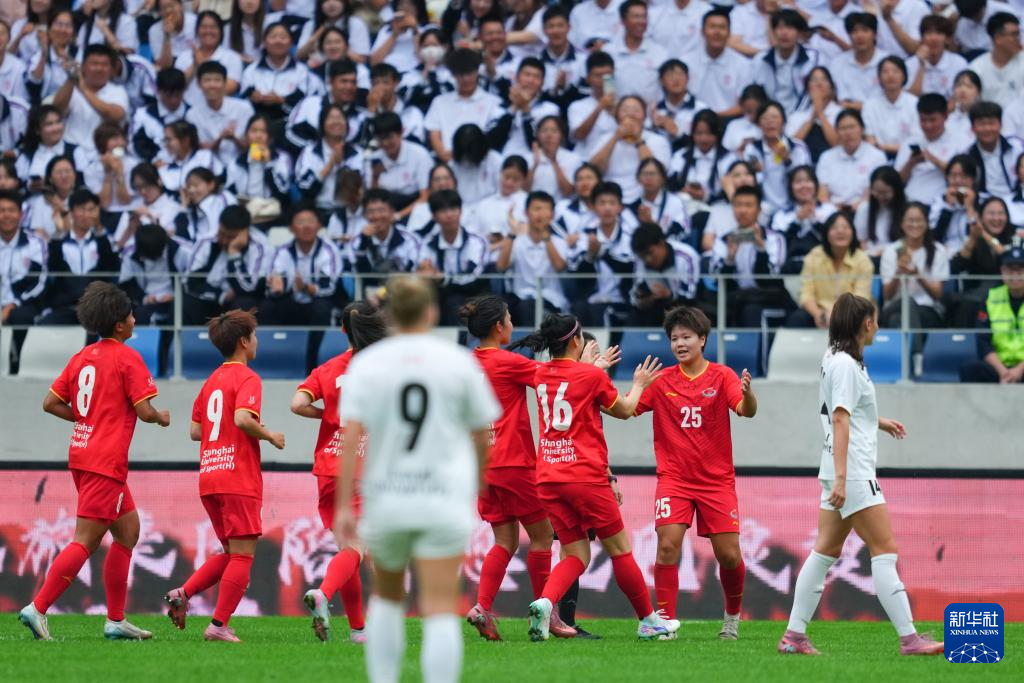 9月27日,上海體育大學女足球員尹麗紅(右二)進球后與隊友慶祝。新華社記者 鄭煥松 攝