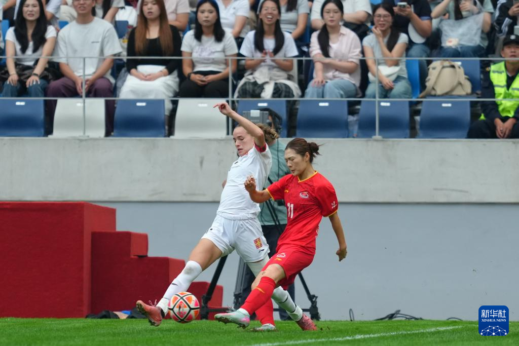 9月27日,上海體育大學女足球員尹麗紅(左二)在比賽中射門得分。新華社記者 鄭煥松 攝