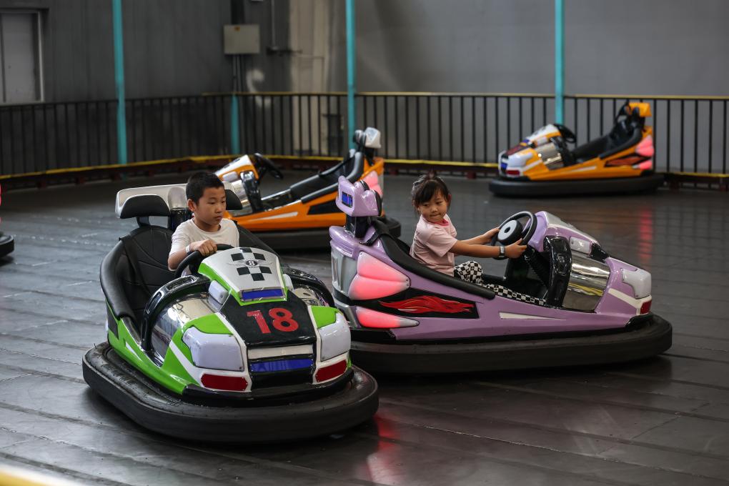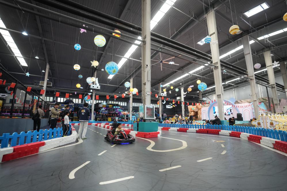 10月8日,小朋友在沈陽糧倉文化產業創意園內的“快樂專+”游樂場體驗游樂項目。  新華社記者 潘昱龍 攝