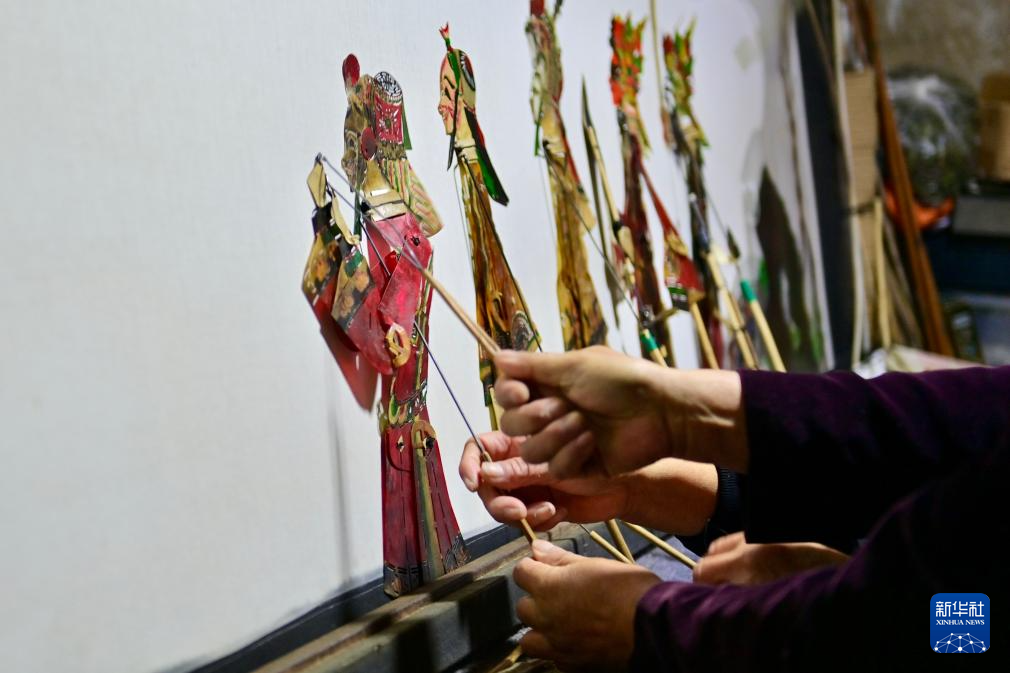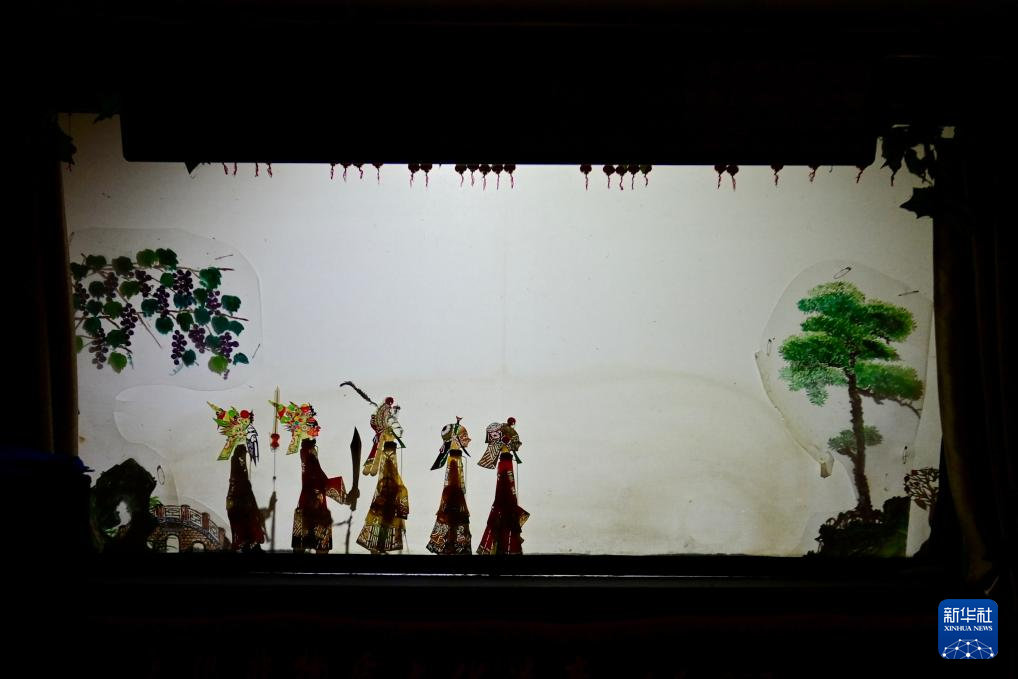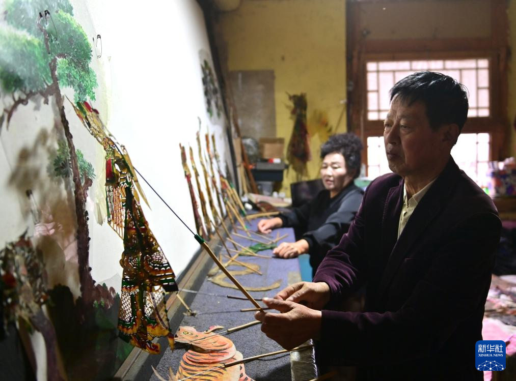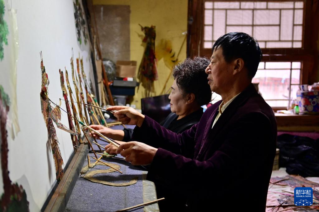 10月13日,寬甸八河川皮影戲第五代傳承人王長水和妻子在表演皮影戲《楊家將》。