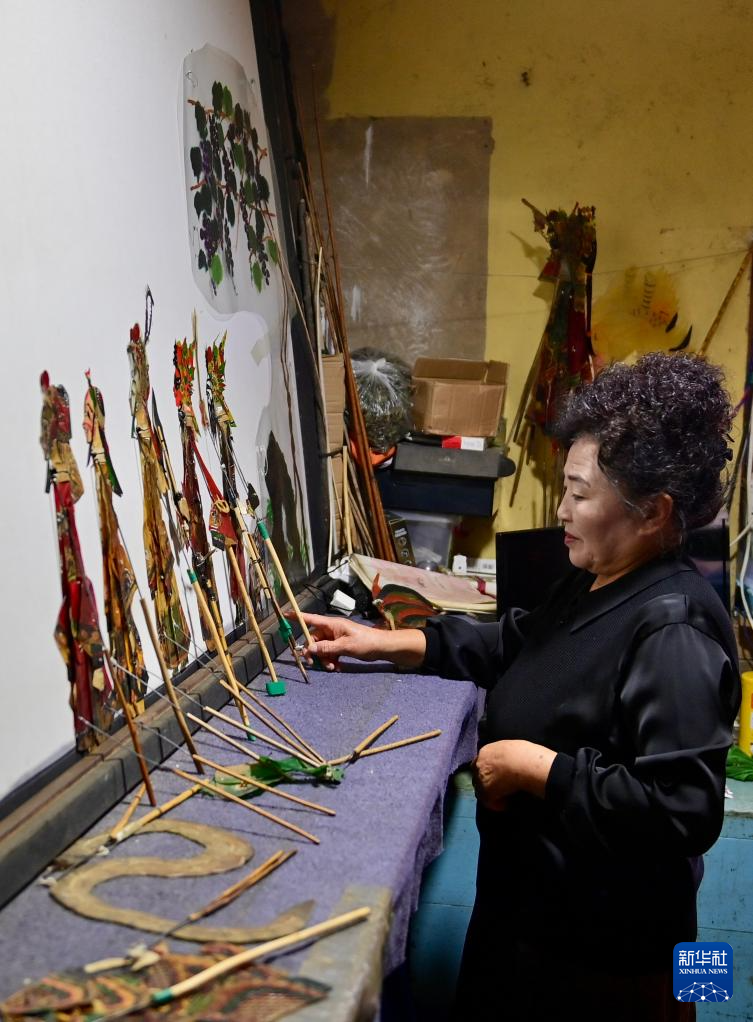 10月13日,寬甸八河川皮影戲第五代傳承人王長水的妻子在表演前布置皮影。