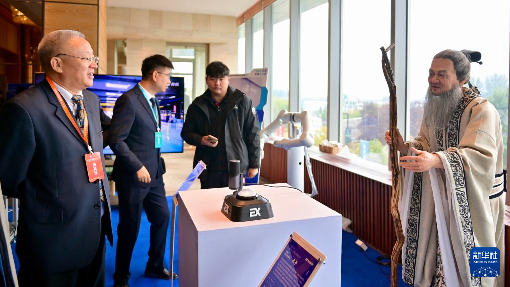 10月17日,一名參會嘉賓在沈陽新次元人形機器人研究院有限公司展臺與交互型仿生人形機器人“孔子”互動。新華社記者 吳青昊 攝