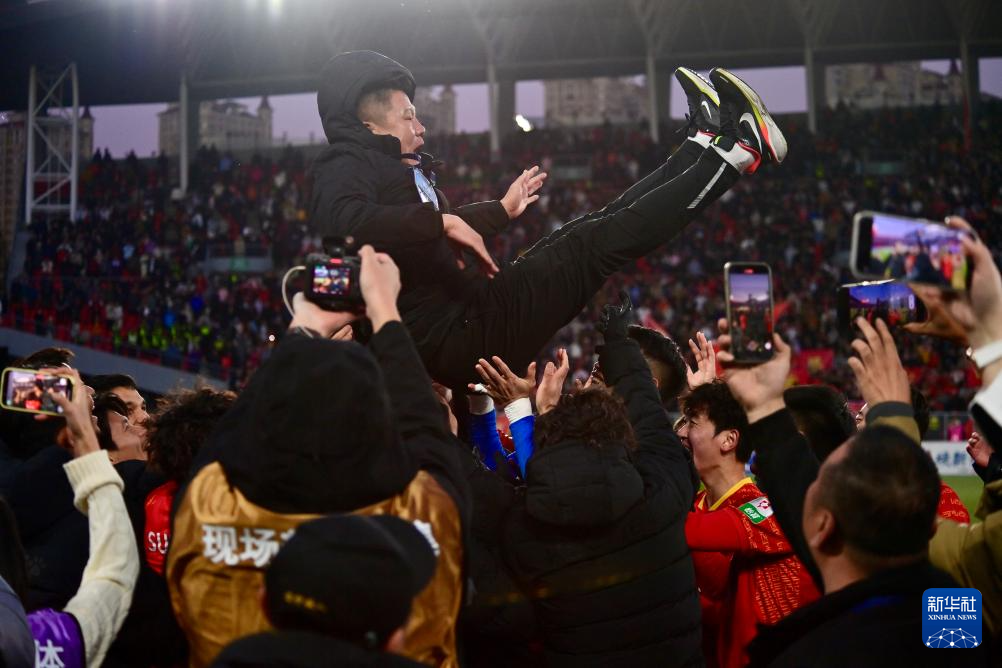 10月26日,遼寧鐵人隊主教練李金羽(上)在賽后被隊員拋向空中慶祝。當日,在遼寧沈陽舉行的2025賽季中國足球協會甲級聯賽第28輪比賽中,遼寧鐵人隊1比0戰勝南通支云隊,提前鎖定中甲聯賽冠軍,并實現沖超目標。新華社記者 吳青昊 攝