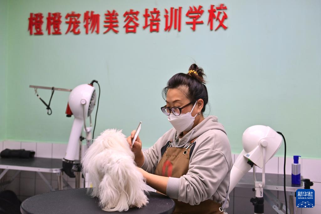 11月7日,在鞍山市鐵西區一家寵物銷售公司開設的寵物美容培訓學校,工作人員在梳理寵物狗毛發。