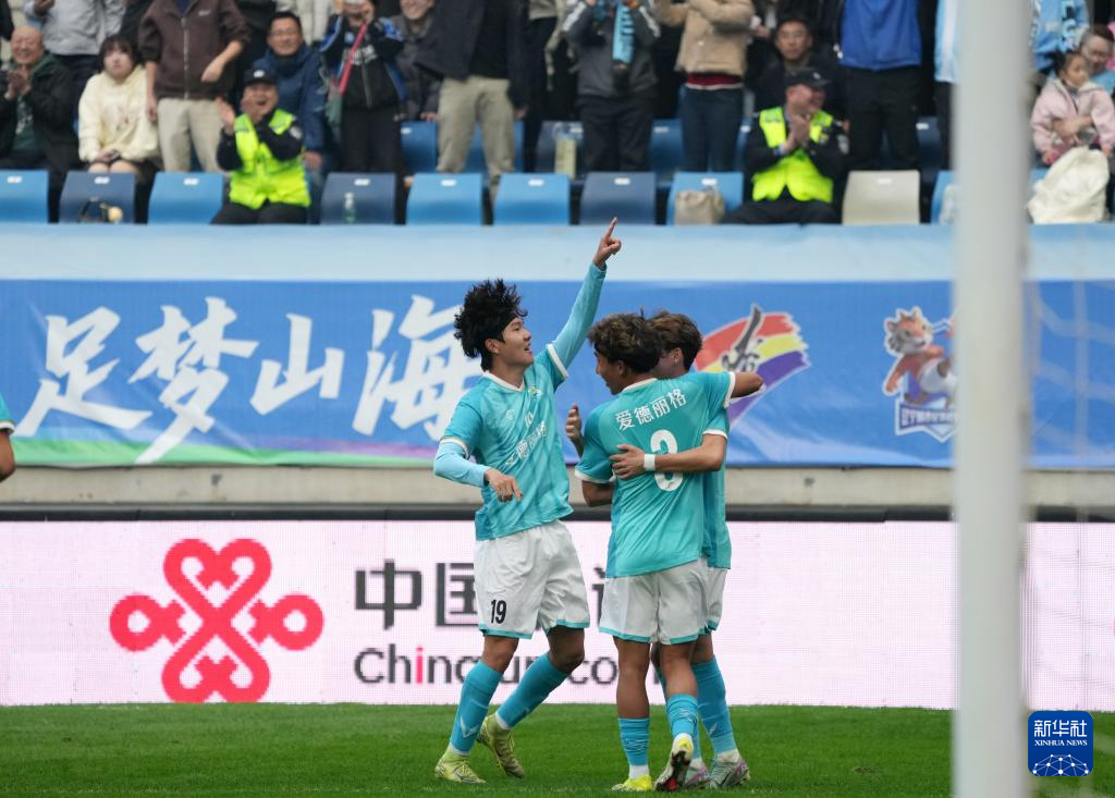 11月15日,大連隊球員王躍皓(左)和隊友慶祝進球。